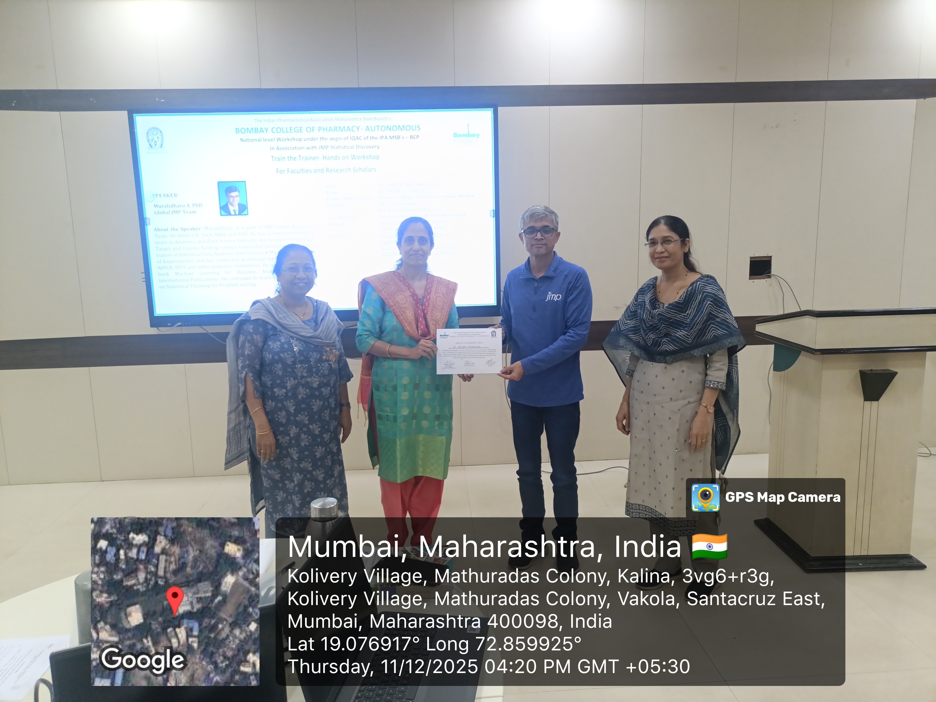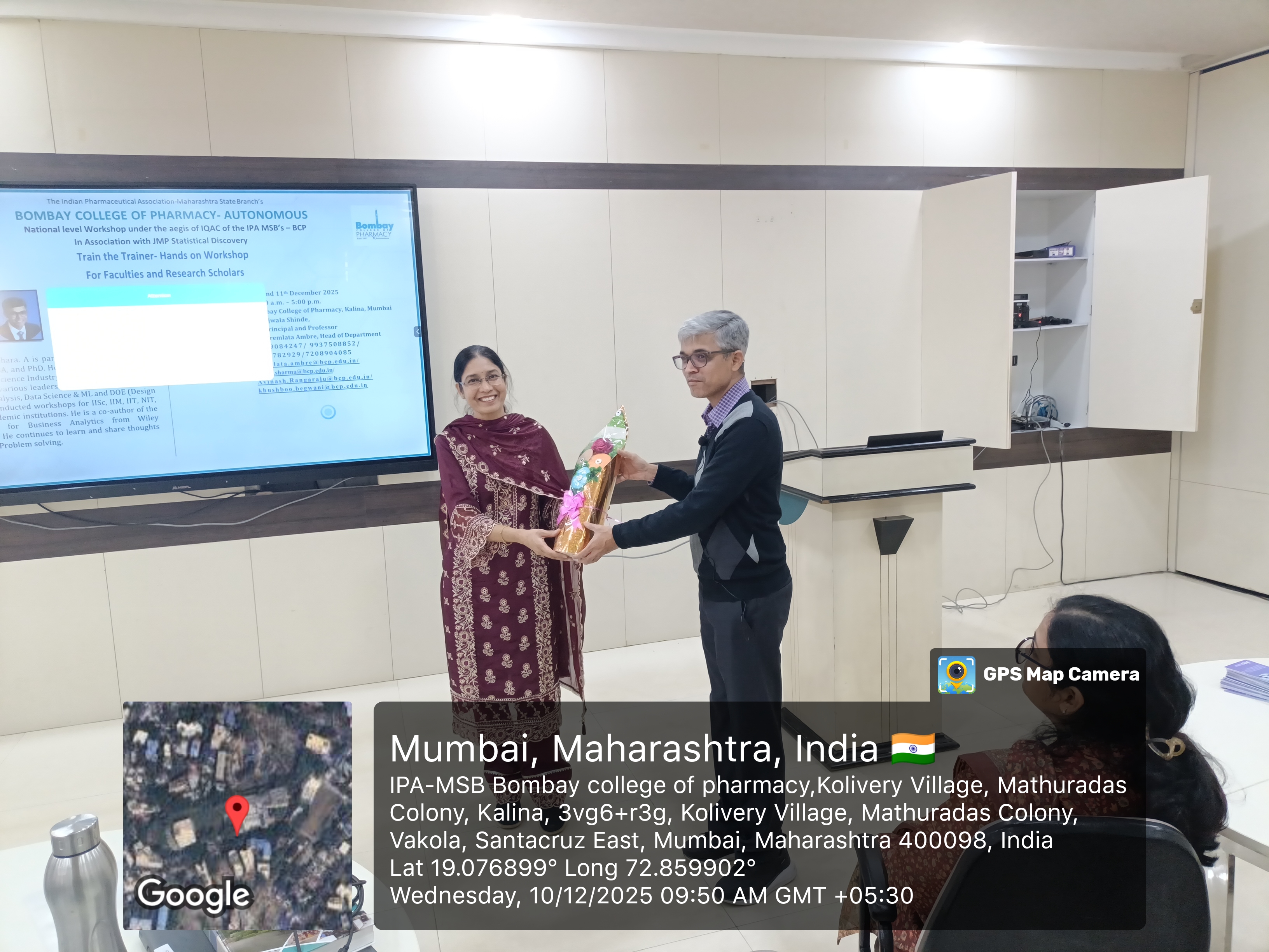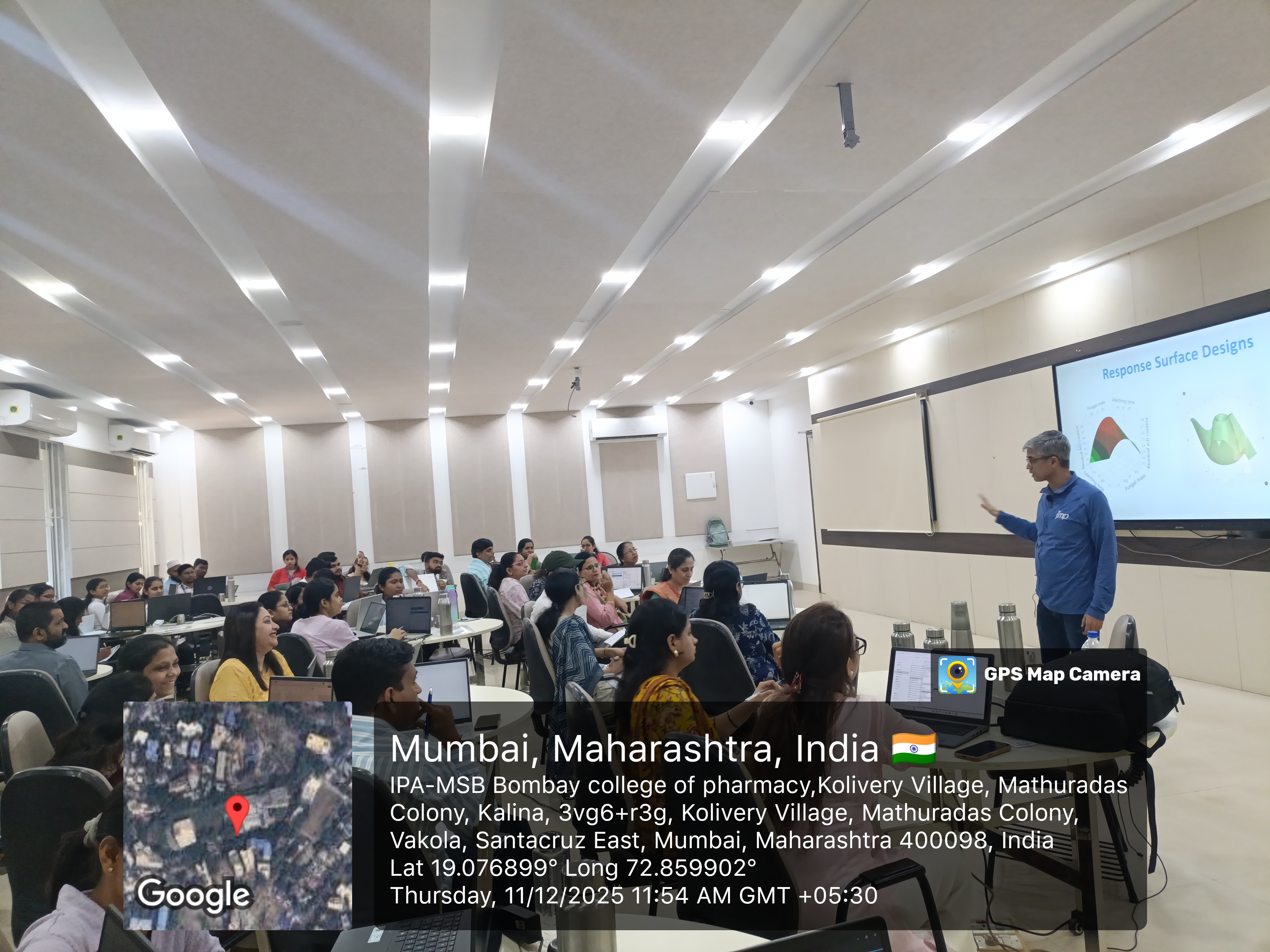 Bombay College of Pharmacy, under the aegis of the Internal Quality Assurance Cell (IQAC) and the Department of Pharmaceutical Chemistry, in association with the Indian Pharmaceutical Association (IPA), Maharashtra State Branch, and JMP Statistical Discovery, organized a National Level Train-the-Trainer Hands-on Workshop on Biostatistics and Design of Experiments (DoE) using JMP Software on 10th and 11th December 2025.